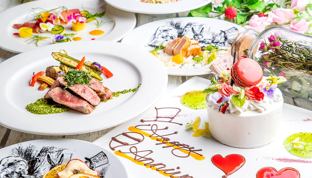 Fantasy cafe restaurant makes you feel magical time.Giant illustrated book will welcome you at the entrance. You will feel as if you jump into the world of fairy tale Alice’s Wonderland.The menu of food is imagined the world of Alice. Their unique dish based on casual French & Italian  use the individual character like “white rabbit” and “Cheshire cat”  “cards soldier”which appear in a tale as the motif.